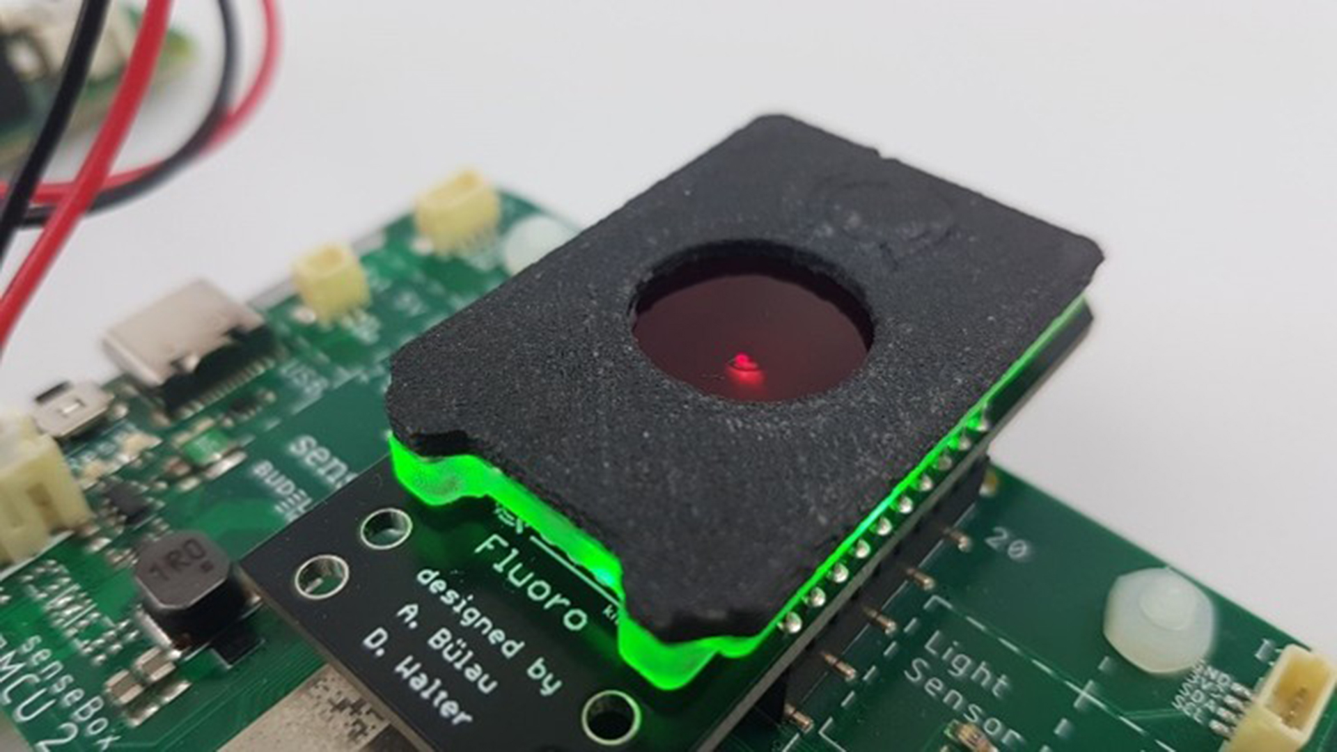 Demonstrator: QOOOL Kit Fluoro, Aufsteckmodul für die senseBox, zur Vermittlung von Fluoreszenz in Diamanten an vier verschieden farbenen LEDs (rot, amber, grün, blau)