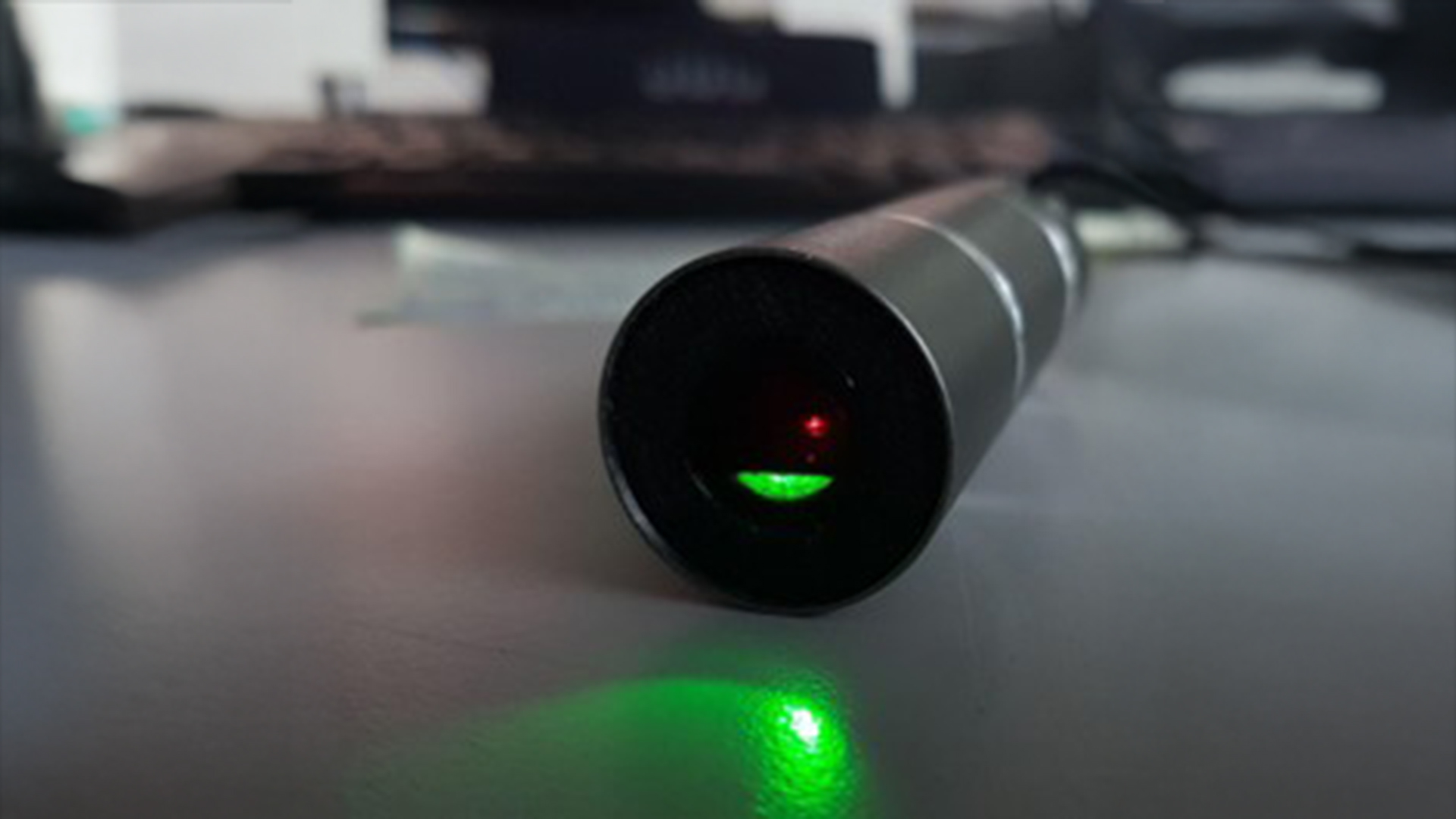 Demonstrator: Taschenlampe: batteriebetriebener Hosentaschendemonstrator zur Vermittlung von Fluoreszenz von Stickstoff-Fehlstellen in Diamanten